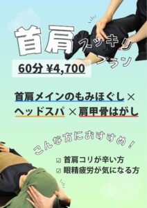 60分の中で、首肩のお悩みが少しでも軽減できるような組み合わせプランとなっております。